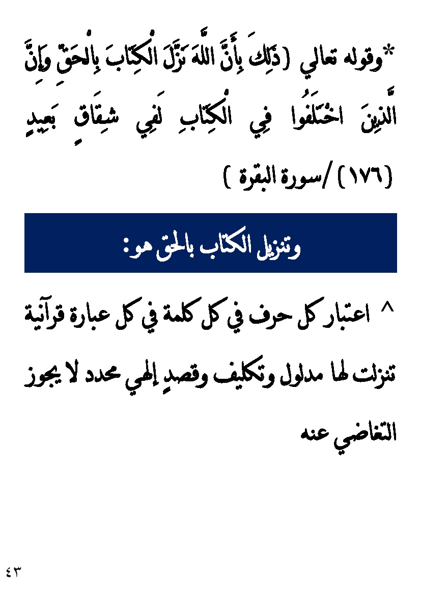* اعتبار كل حرف في كل كلمة في كل عبارة قرآنية تنزلت لها مدلول وتكليف وقصدٍ إلهي محدد لا يجوز التغاضي عنه